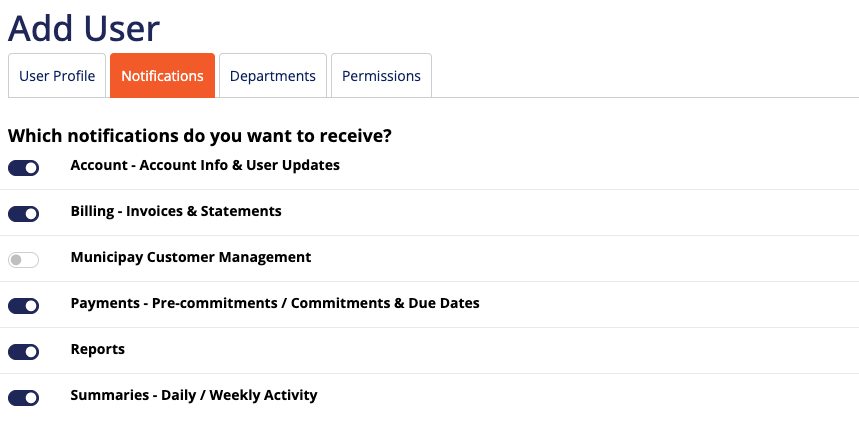 You'll be asked to fill out the new user's Profile, Notification Preferences, Department Access, and Permissions.