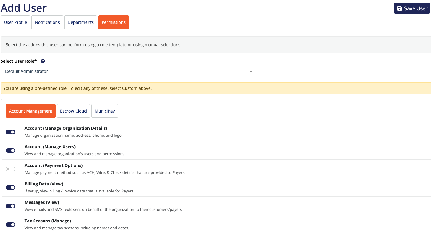 For local government offices, you'll be prompted to select the Departments that user should have access to. This allows you to restrict the user to specific reporting within your office's setup. Departments can be setup during onboarding or modified by customer service.