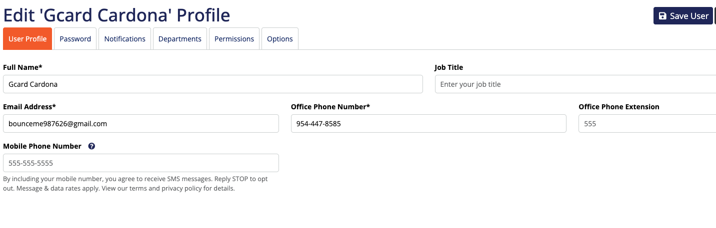 Similar to the Add New User screen, you'll be presented the same options of editing a user's Profile, Password, Notifications, Departments, Permissions, Options. "Click "Save User" once completed.