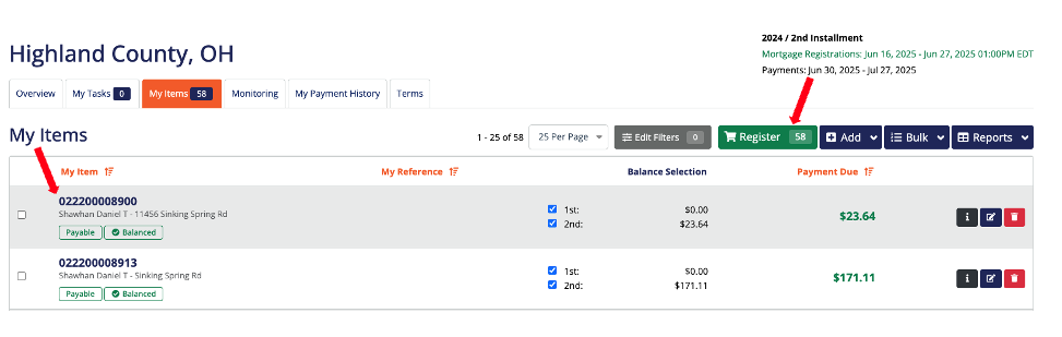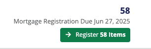 Under the My Items column, if a government office is currently in its Mortgage Registration season, you'll see a green "Register" button along with the number of items available to register.