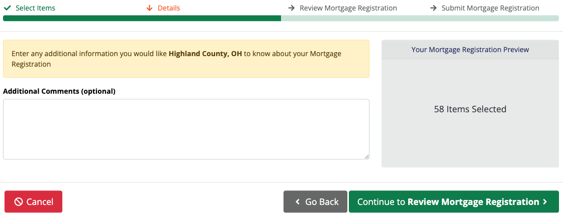 Here, you can enter any additional information you'd like to send along with your mortgage registration. Click “Continue to Review Mortgage Registration.”