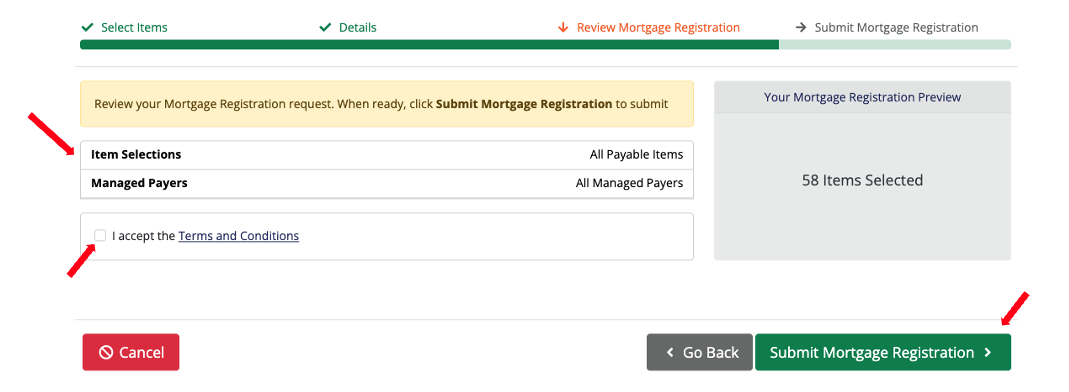 Review all details of your submission for accuracy. Check the box to accept the Terms and Conditions, then click “Submit Mortgage Registration” to send your file to the government office.