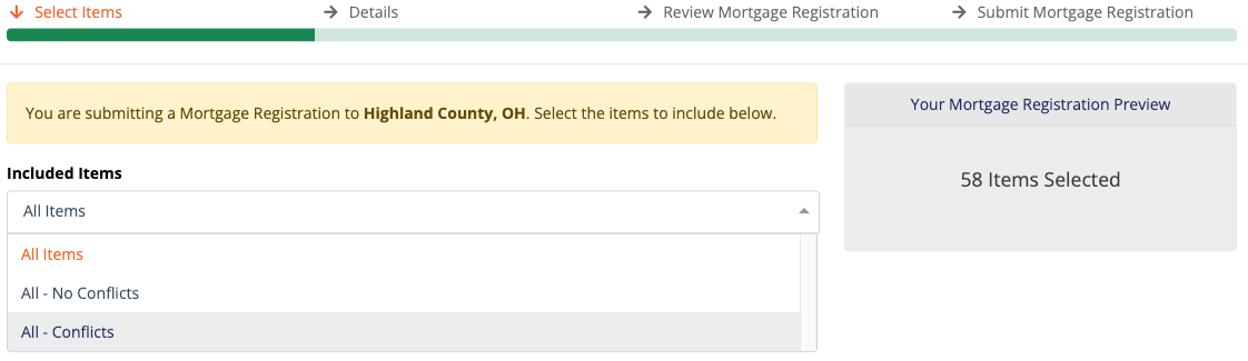 A pop-up overlay will appear, confirming that you’re submitting a mortgage registration to the selected government office. Use the dropdown to select which items you'd like to submit.