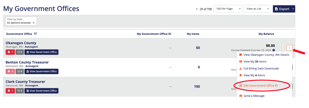 Find the tax office you want to update and click the three dots next to the selected tax office.